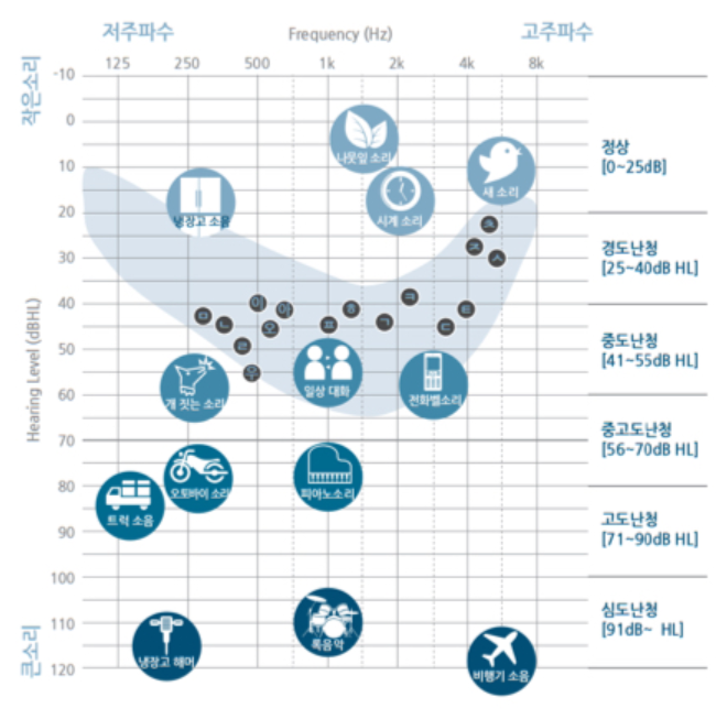 ▶ 고도 난청 : 71~90dB - 바로 옆에서 큰소리로 말해도 대화 어려움. 보청기 없이는 아예 대화 불가능함.