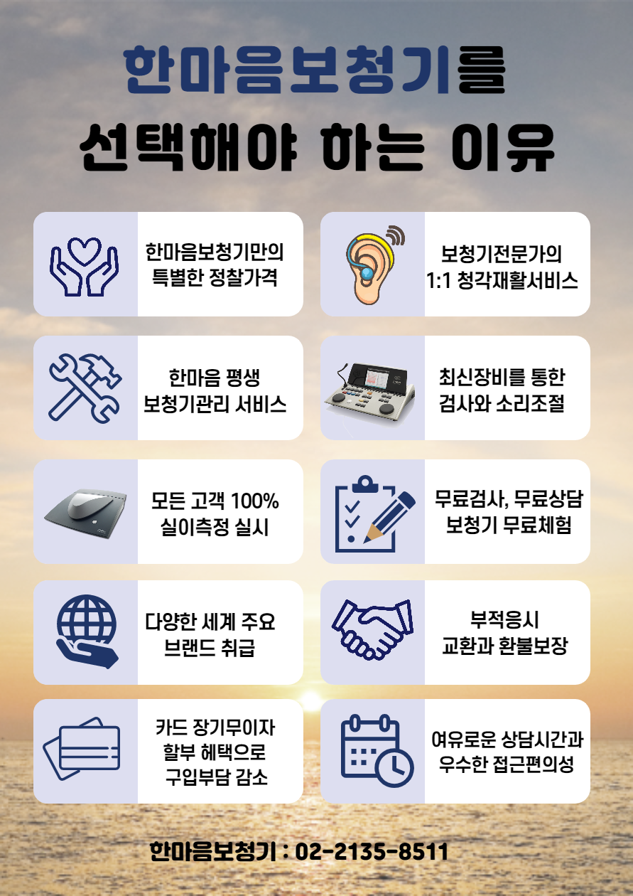박동성 이명은 불안감을 주는 증상이지만, 동시에 신체가 보내는 중요한 신호이기도 합니다. 심장박동과 연결된 리듬은 혈류나 귀 주변 구조의 변화를 반영하므로, 체계적인 평가를 통해 주의가 필요한 부분과 그렇지 않은 부분을 구분할 수 있습니다. 전문의와의 명확한 소통, 청력검사를 포함한 적절한 검사, 그리고 실생활에서의 실천 가능한 관리법을 결합하면 대부분 효과적인 해결책을 찾을 수 있습니다. 한마음보청기에서는 전문 청력검사와 상담을 통해 여러분의 청각 건강을 세심하게 케어하고 있습니다. 귀 건강에 관한 궁금증이 있으시다면 언제든 방문하셔서 상담해보시기 바랍니다.