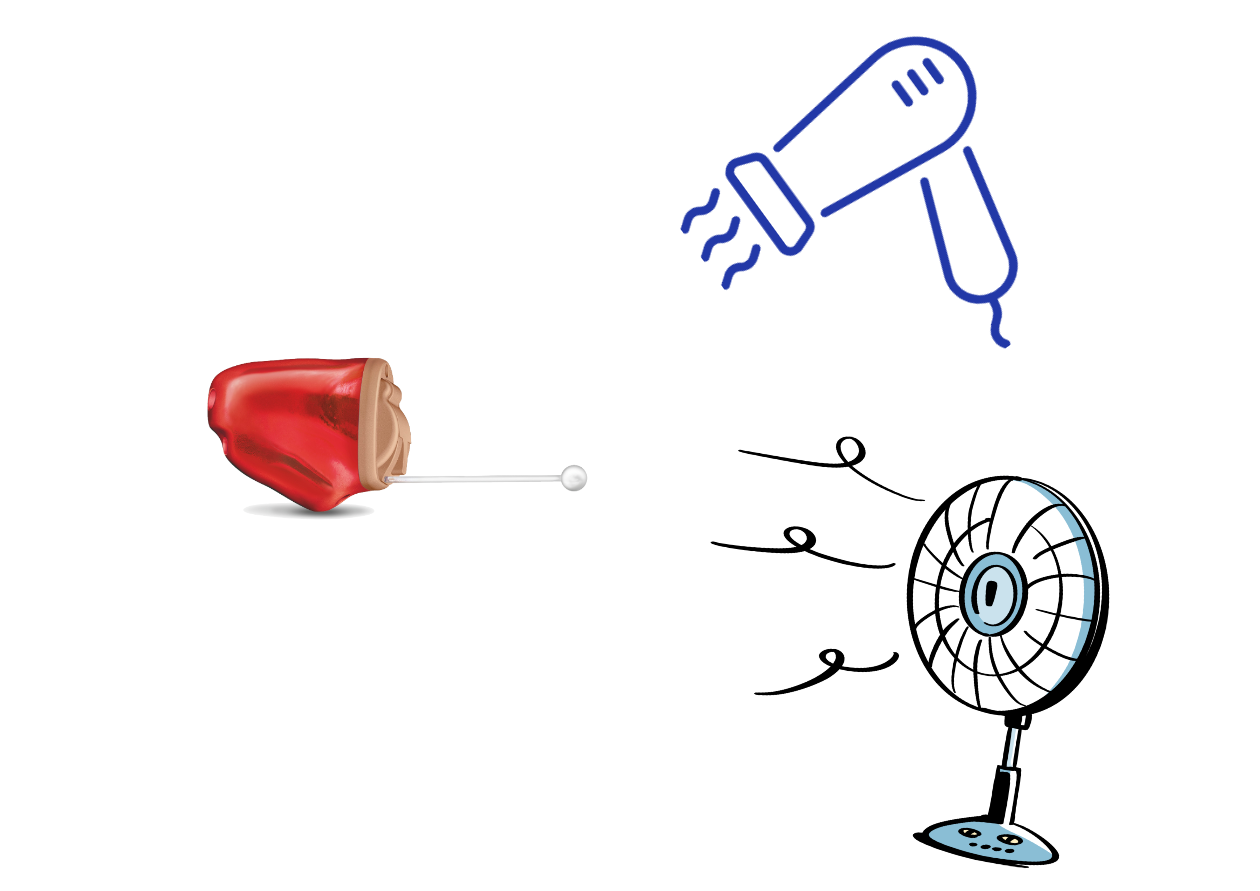 4. 선풍기나 헤어드라이기의 찬바람으로 보청기를 말립니다. 이때 뜨거운 바람으로 보청기를 건조시키는 것은 피해야 하며 만약 찬바람이 나오지 않는 헤어드라이기라면 가능한 낮은 온도의 바람을 이용하도록 하고 헤어드라이기를 보청기와 약간의 거리를 둔 채 말리도록 합니다. (뜨거운 바람은 물만큼이나 보청기 같은 작은 전자제품에 안 좋습니다. 만약 선풍기가 없거나 낮은 온도의 바람이 나오는 헤어드라이기가 없다면 이 과정은 생략해도 됩니다.)