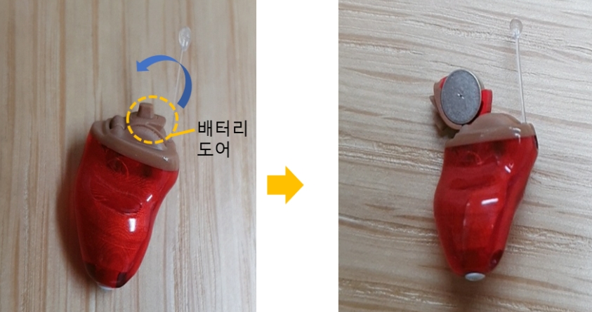 2. 배터리 도어를 열고 배터리를 꺼냅니다. 그리고 꺼낸 배터리는 아까워하지 마시고 그대로 쓰레기통에 버리도록 합니다. (가능한 빨리 배터리를 보청기로부터 제거하는 것이 중요합니다)