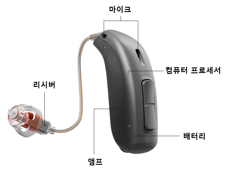 보청기는 기본적으로 마이크, 앰프, 리시버로 구성이 되어 있으며 수신되는 소리를 증폭하고 조정하여 귀로 전달하는 일종의 초소형 음성확장장치로 볼 수 있습니다.