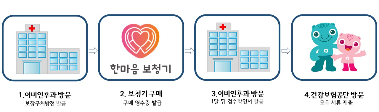 복지카드를 발급받았다면 이제 보청기를 구입하고 보조금을 신청합니다. 절차는 다음과 같습니다.