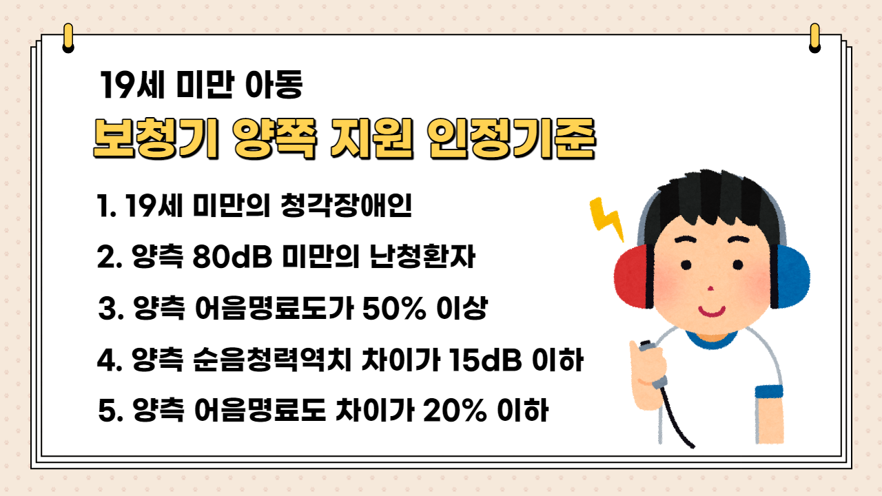단, 19세 미만의 청각장애인의 경우 일정 요건에 모두 충족될 경우 양쪽 보청기 모두에 대하여 지원이 됩니다.