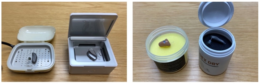샤워나 목욕, 수영 등 물과 가까이 해야 할 때는 반드시 보청기를 제거해야 하며 밤에 자기 전에는 보청기를 꼭 습기제거기 안에 보관하여 하루 동안 쌓인 습기를 밤새 제거해 주셔야 합니다. (그리고 이때는 배터리 도어를 열어두어 내부의 습기까지 제거되도록 합니다)