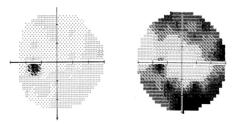 ▶ 시야검사 : 시야의 손상 여부를 확인하기 위한 검사로 녹내장으로 진단이 되면 이후에 정기적으로 실시하게 됩니다. 어두운 암실에서 이마와 턱을 고정한 상태로 정면의 한 점을 보고 있다가 작은 빛이 불규칙적으로 여기저기 눈 앞에 나타나면 빛을 보았다고 생각되었을 때 버튼을 누르면 되는 검사입니다. 이때 눈을 움직이지 않은 채 검사를 진행해야 하는데 본능적으로 눈이 움직이다 보니 검사시간이 오래 걸리기도 합니다.