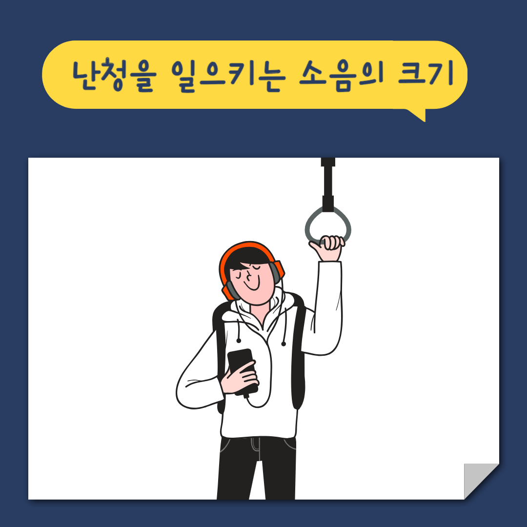 우리가 흔하게 접하게 되는 대중교통 환경의 소음은 80데시벨 정도입니다. 그런데 버스나 지하철을 타면서 이어폰을 사용할 경우 이보다 더 큰 소리인 100데시벨 정도로 음악을 듣게 됩니다. 100데시벨 정도의 소리는 전기톱이나 전동 드릴에서 발생하는 소음의 크기로 이 정도 크기의 소음은 하루 2시간 이상 계속 들을 경우 난청이 유발될 수 있습니다.