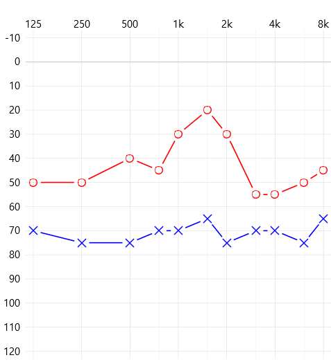 청력도는 가로축에 주파수(Hz), 세로축에 음의 강도(dB)를 표시한 그래프입니다. 우측 귀는 빨간색 동그라미, 좌측 귀는 파란색 X로 표시되며, 각 주파수별로 측정된 역치가 연결됩니다.