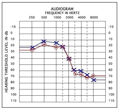 따라서 연결되어 있는 선이 아래로 내려와 있을수록 난청이 심한 것이며 선이 위에 있을수록 난청의 정도가 덜한 것입니다.