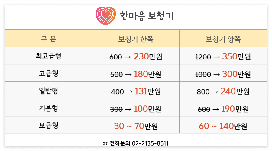 그래서 한마음 보청기에서는 이번 여름 기간 동안 보장구 전용 제품도 정부 고시 가격 + 추가 할인 가격으로 판매를 하고 추가로 구매하시게 되는 보청기 또한 큰 부담 없이 구매하실 수 있도록 할인하여 판매를 하기로 하였습니다!