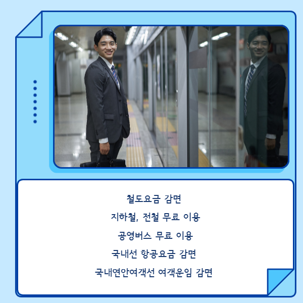 - 철도요금, 지하철, 공영버스 : 이용 시 복지카드 제시 (코레일 1544-7788)
