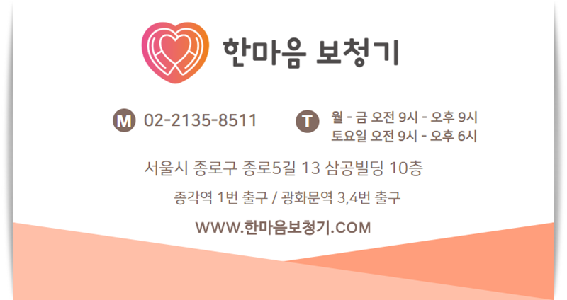저희 한마음보청기 또한 모든 고객분들께서 보청기에 편안하게 적응하고 만족스럽게 착용하실 수 있도록 늘 최선을 다하고 있습니다. 난청과 보청기에 대하여 궁금한 점이 있으시다면 언제든지 한마음보청기로 문의하시기 바랍니다.