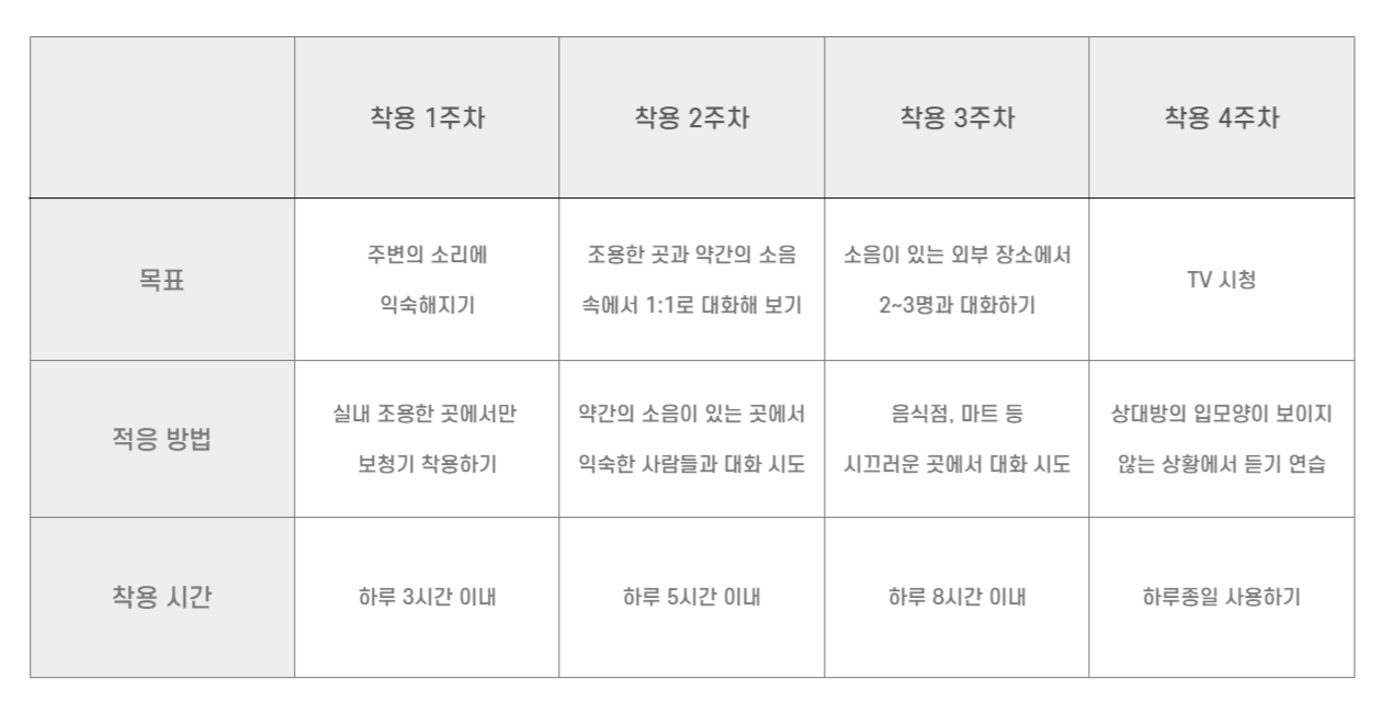 그럼 지금부터 보청기에 보다 편안하게 적응을 하기 위한 1개월 계획표를 안내해 드리겠습니다.