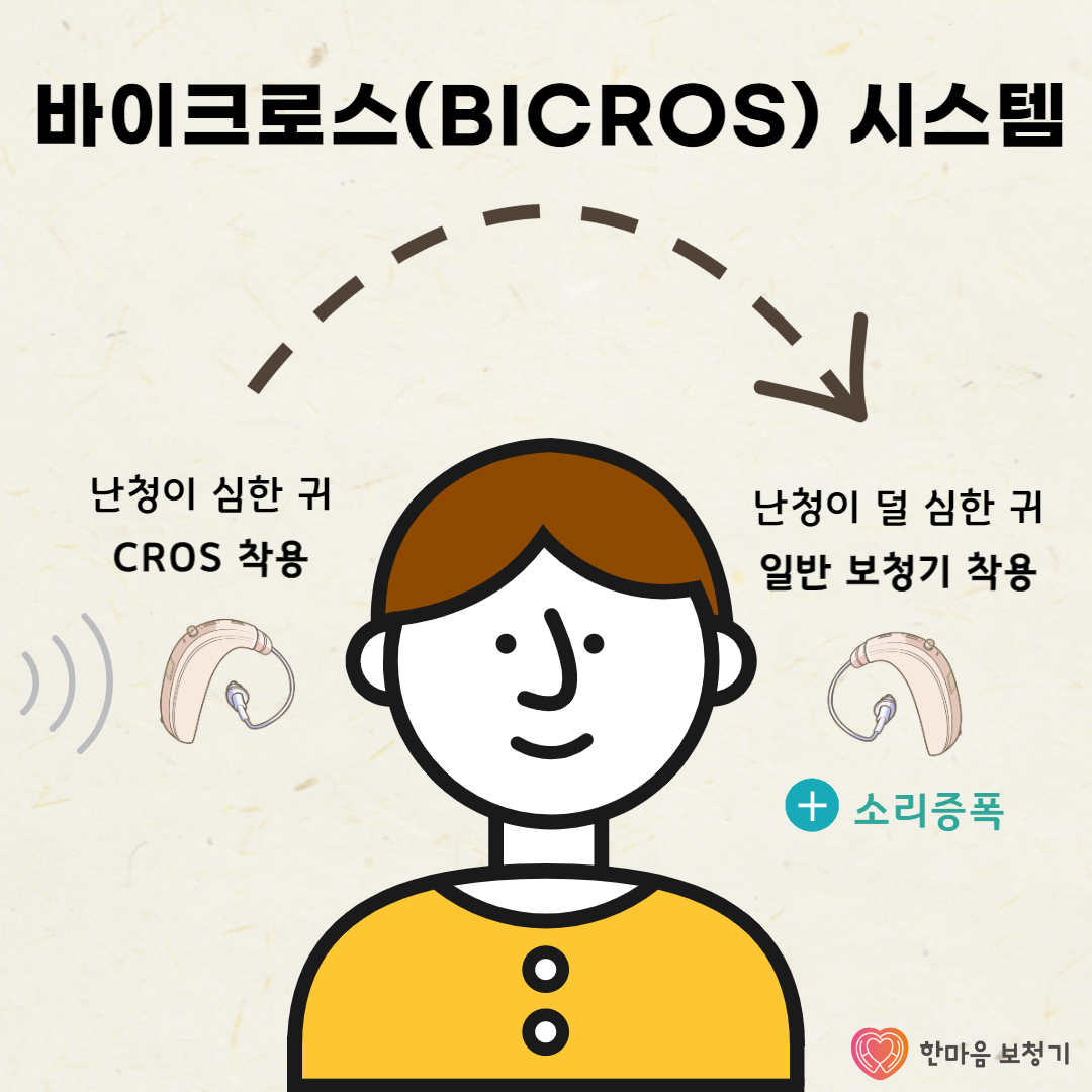 크로스 시스템에는 바이크로스(BICROS)라는 종류도 있는데 이는 한쪽 귀가 고심도 난청이거나 농이면서 소리가 조금 더 잘 들리는 반대쪽 귀도 난청이 있는 경우 사용되는 시스템입니다. 기본적으로 일반 크로스 시스템과 동일한 방식으로 작동이 되지만 이때 다른 점은 수신기 역할을 하는 보청기에도 이득을 주어 소리를 증폭해 준다는 점입니다.