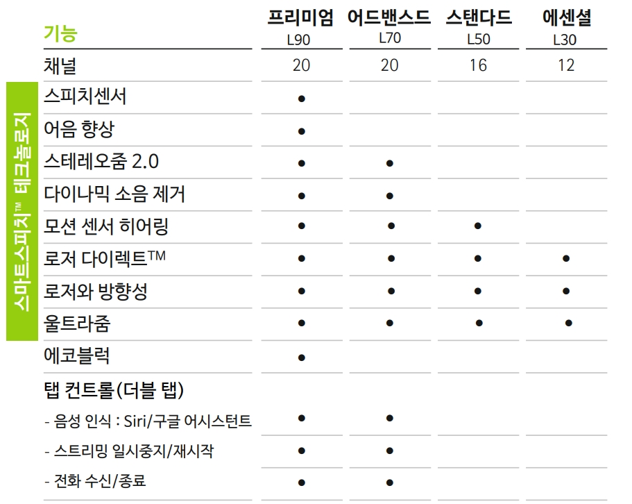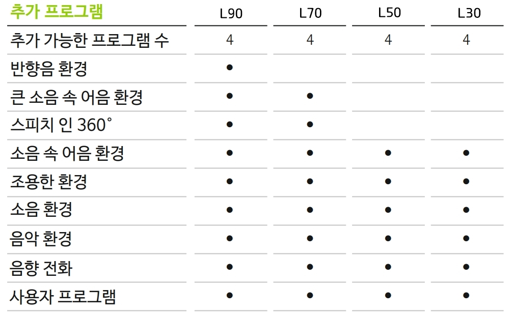 ● 스피치 인핸서와 다이나믹 소음 제거 : 스피치 인핸서 기능으로 조용한 환경에서 속삭이는 작은 말소리도 더욱 잘 들리게 되었으며 다이나믹 소음 제거 기능으로 배경 소음을 최소화하여 소음 환경 속에서 편안한 청취를 제공하고 말소리 이해도를 더욱 높였습니다.