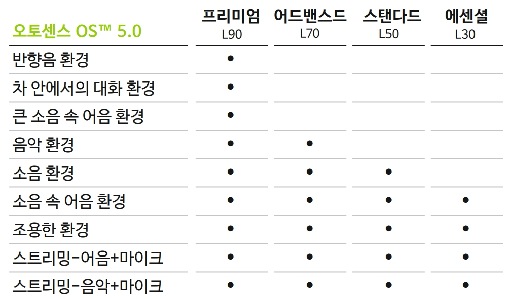 ● New 오토센스 OS 5.0 : 인공지능을 기반으로 주변 환경을 1초당 700번 스캔하여 자동으로 보청기 프로그램을 변경해주는 오토센스 OS가 더욱 업그레이드 되었습니다.