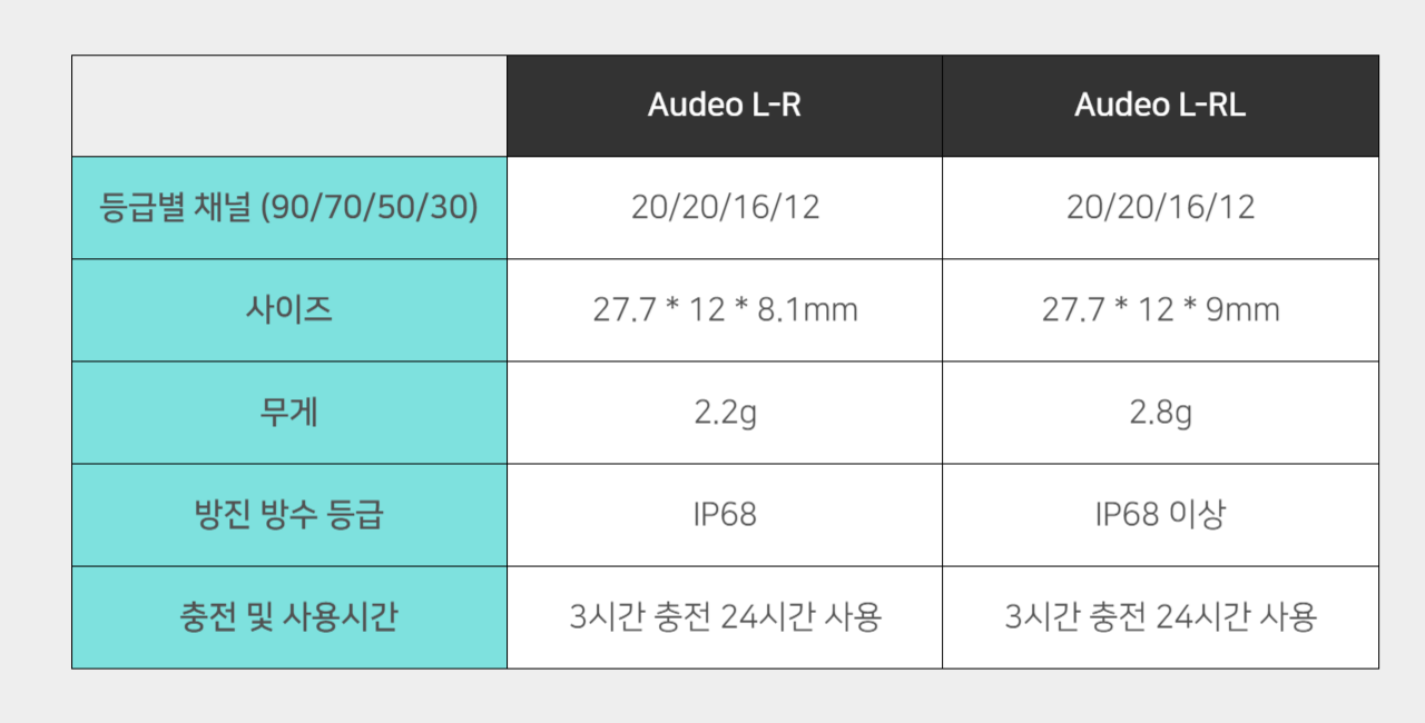 '오데오'라는 이름에서 알 수 있듯이 오픈형 보청기이며 Audeo L-R (오데오 루미티 충전형)과 Audeo L-RL (오데오 루미티 충전형 라이프)의 두 가지 모델 중에서 선택이 가능합니다. 이 두 가지 모델은 기능면에서는 동일하나 다만 라이프가 방수 기능이 한층 더 강화된 모델이라는 차이가 있습니다.