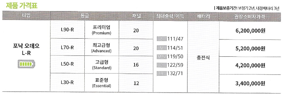 포낙의 오데오 루미티는 모두 충전형으로만 구입이 가능하며 일반 충전형과 방수 기능이 강화된 루미티 라이프 중에서 선택이 가능합니다. 제조사에서 정해 놓은 루미티의 소비자가격은 아래와 같습니다.