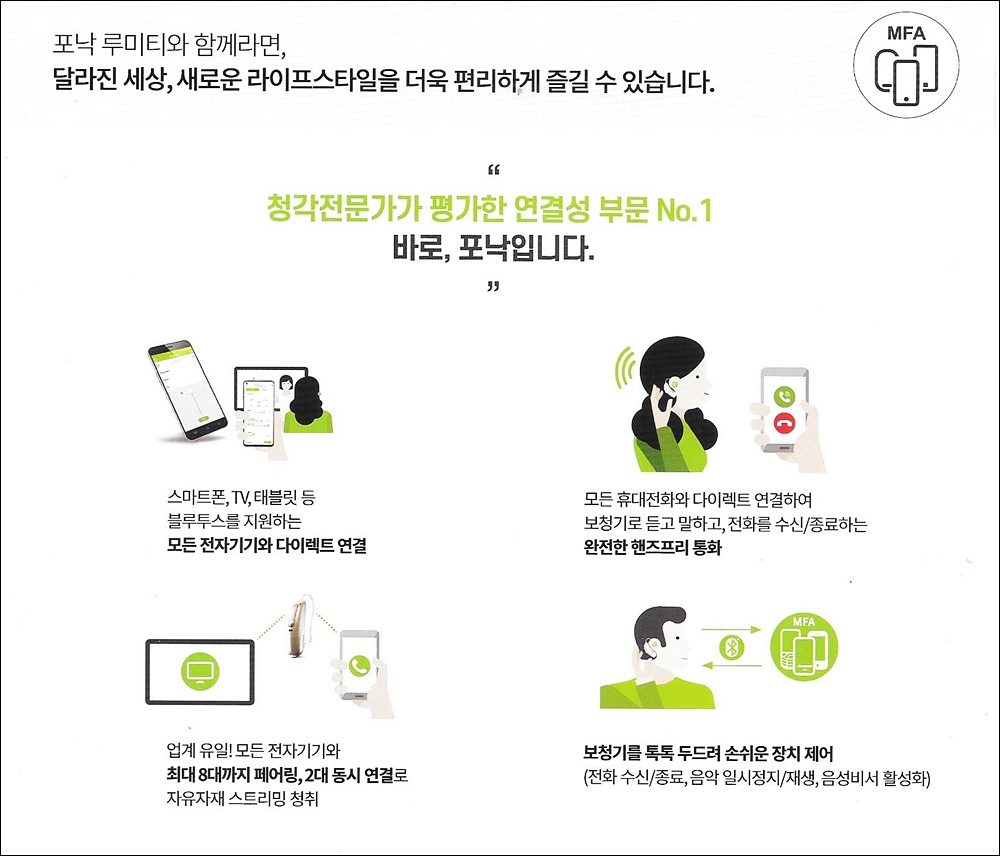 또한 아이폰, 안드로이드폰 상관 없이 모든 휴대폰과 다이렉트 연결이 가능하여 보청기로 통화를 하고 전화를 끊고 받는 것까지 모두 가능해 완전한 핸즈프리 통화를 할 수 있습니다.
