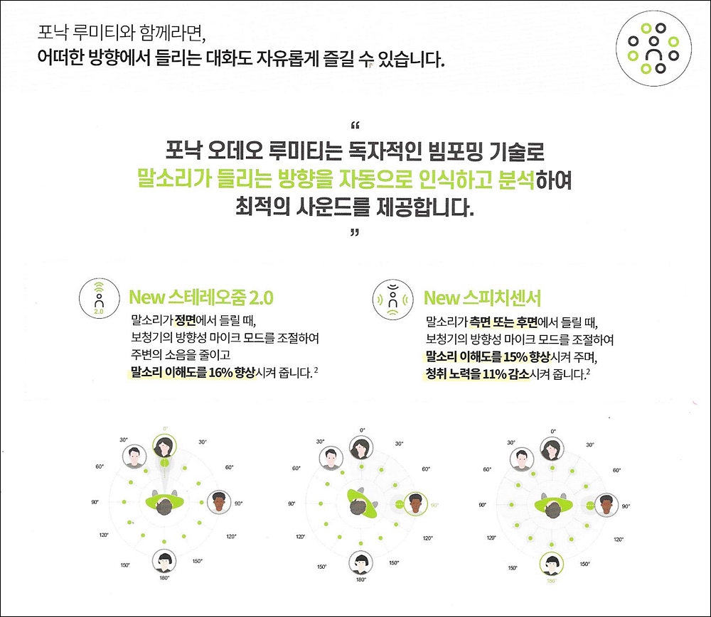 루미티 스마트스피치 기술에서 새롭게 선보이는 스테레오줌 2.0은 기존의 방향성 마이크 기술을 한단계 업그레이드한 것으로 그동안의 방향성 마이크가 전방의 소리에만 집중했건 것과 달리 스테레오줌 2.0은 주변 소음이 심하지 않을 때는 말소리와 환경음을 동시에 인식을 하다가 주변 소음이 커질 경우 주변 소음은 줄이면서 자연스럽게 전방에 있는 사람 말소리에 집중할 수 있도록 해줍니다.