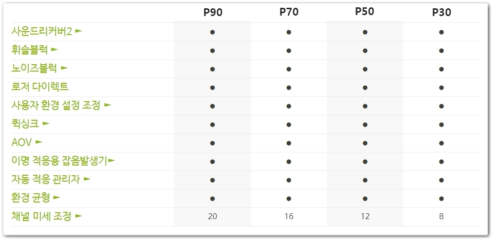 우선 등급별로 채널 수에 차이가 있습니다. P90과 P70은 20 채널, P50은 16 채널, P30은 12 채널로 비싼 제품일수록 채널 수가 많고 등급이 아래로 내려갈수록 채널 수도 줄어들게 됩니다. 채널이란 낮은 소리의 저주파수부터 높은 소리의 고주파수로 이루어진 주파수 대역을 나눈 값으로 채널 수가 많을수록 좀 더 세밀한 조절이 가능합니다.