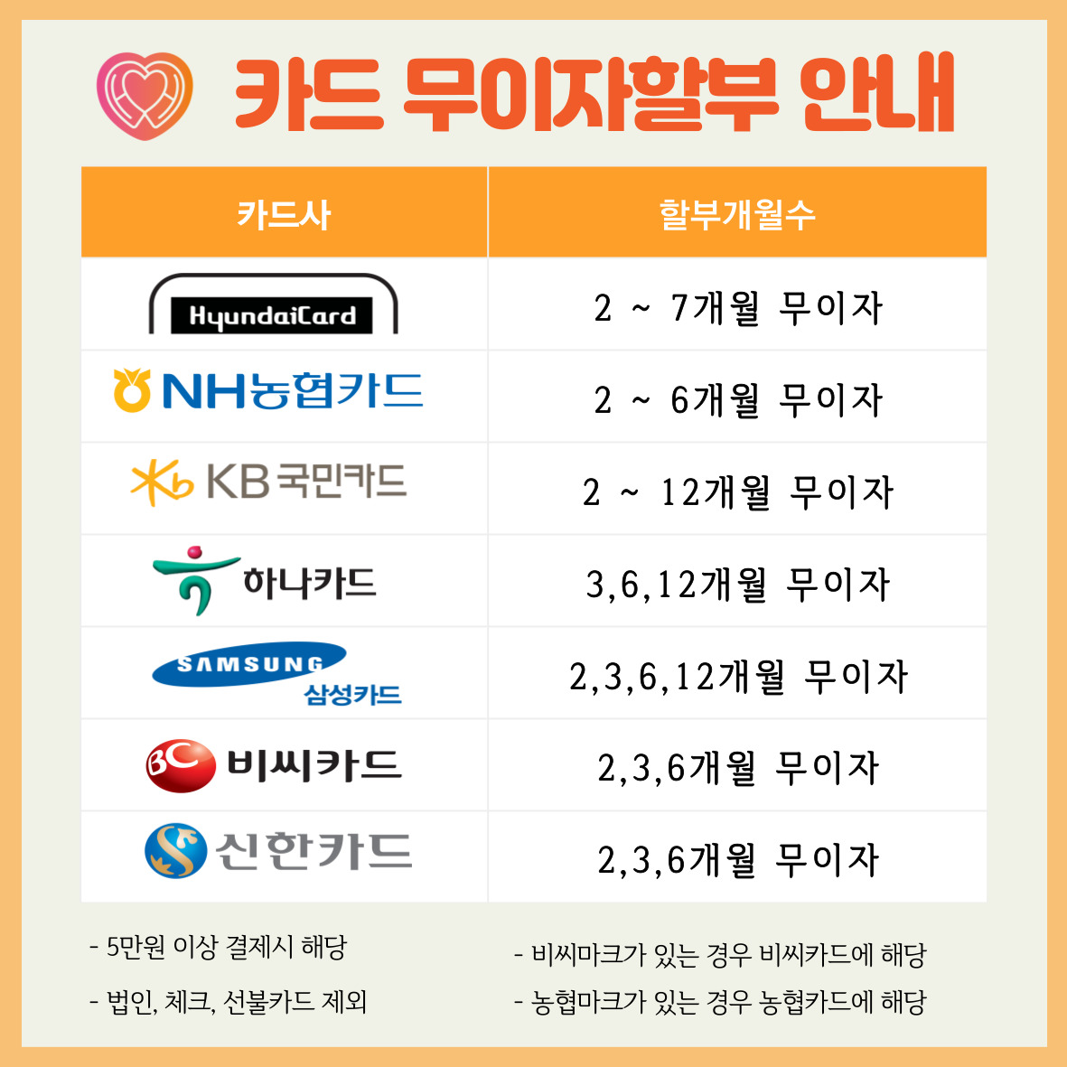 다양한 카드의 무이자 할부를 준비하고 있습니다.