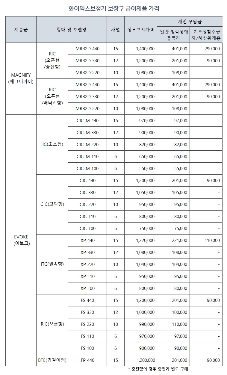 특히 와이덱스의 경우 매그니파이나 이보크 모두 가장 최고 등급인 440까지 선택이 가능하기 때문에 지원금을 받아 보청기를 구입하실 예정이시라면 이왕이면 높은 등급의 보청기를 선택하시는 것을 추천해 드립니다.