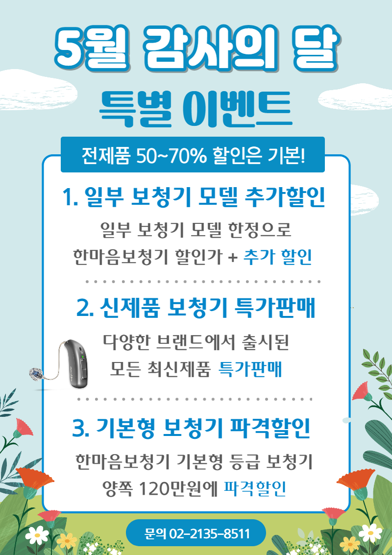 한마음보청기에서 이번 5월을 맞이하면서 준비한 보청기가격 할인 이벤트를 안내해 드리도록 하겠습니다~